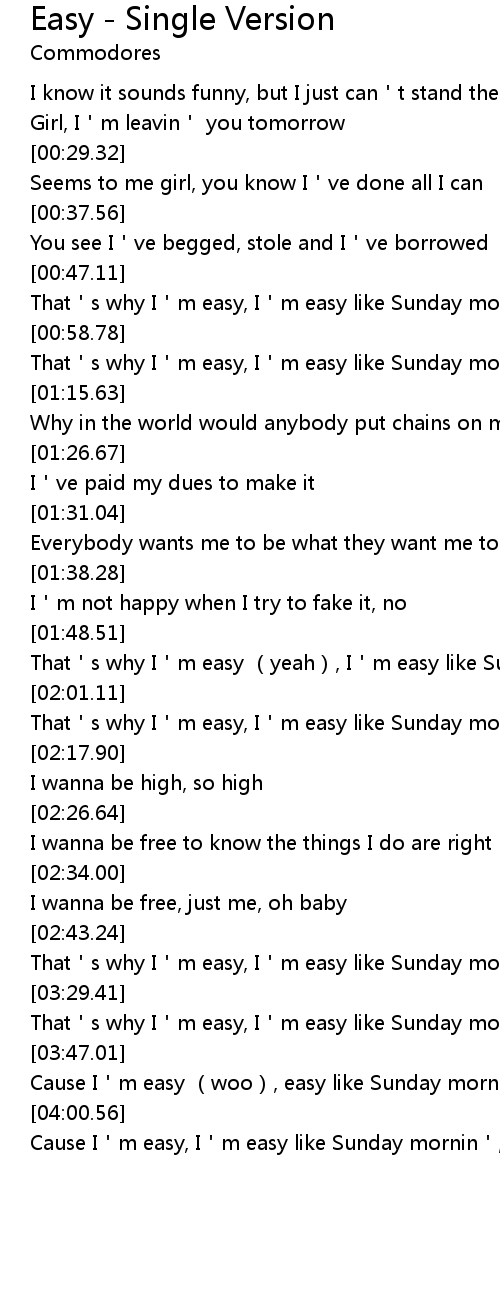 | [01:03.89] | That s why I m easy, I m easy like Sunday mornin |