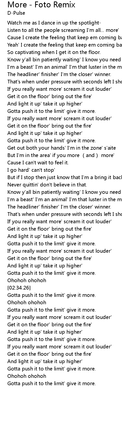 | [02:37.12] | Gotta push it to the limit' give it more. |