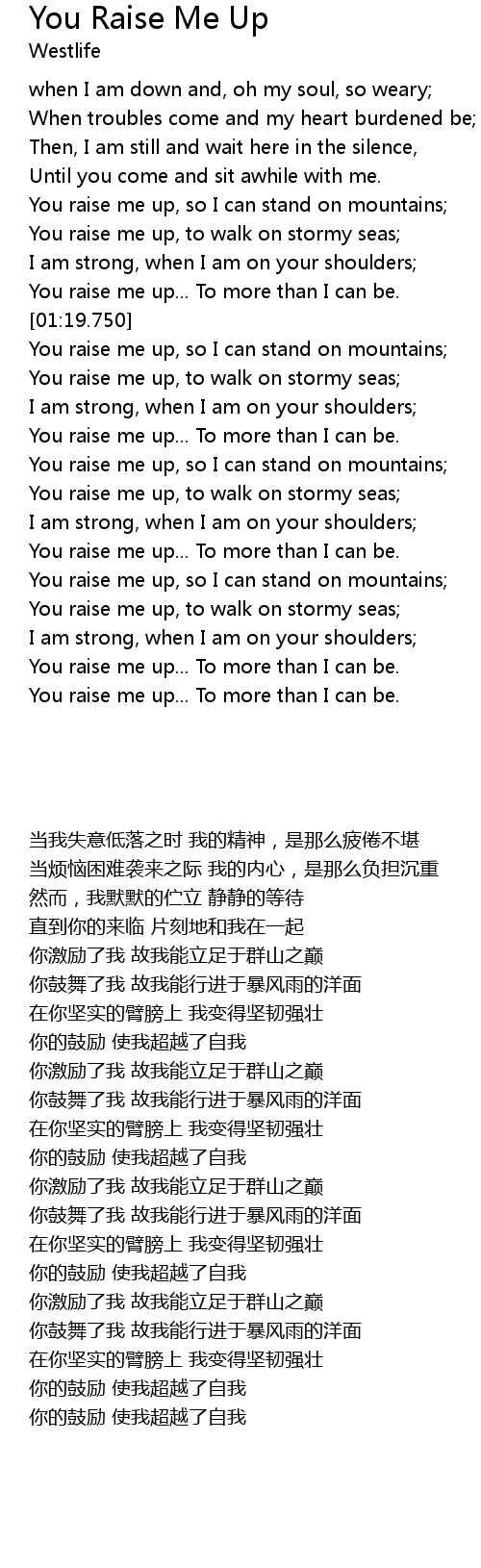 | [01:49.450] | You raise me up, so I can stand on mountains |