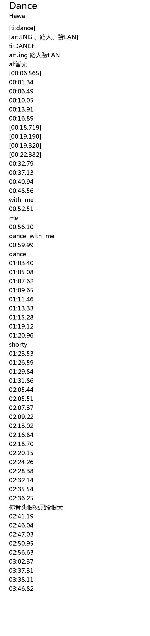 | [02:35.656]02:36.25] | 眼神开始秒杀我管你breaking 还是hiphop 你骨头很硬屁股很大 |