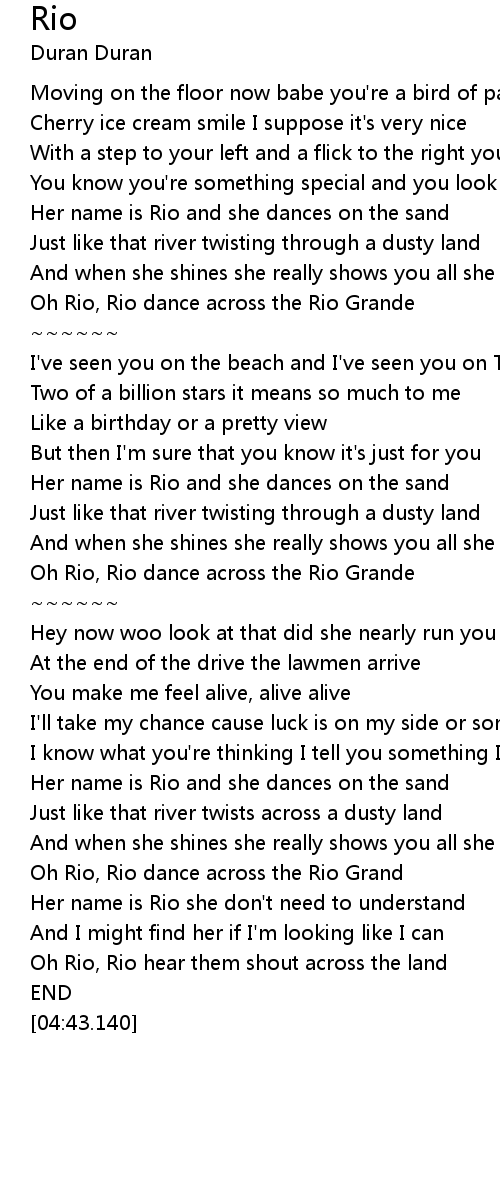 | [04:17.100] | Oh Rio, Rio dance across the Rio Grand |