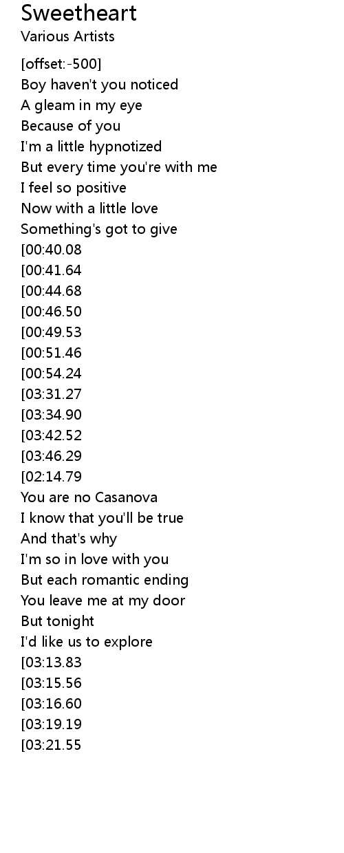 | [04:00.81][03:42.52][02:05.59][01:07.34] | Won't you be my sweetheart |