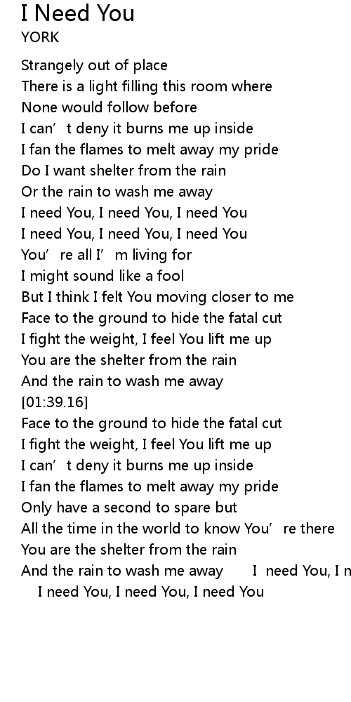 | [02:45.05] | And the rain to wash me away I need You, I need You, I need You I need You, I need You, I need You |