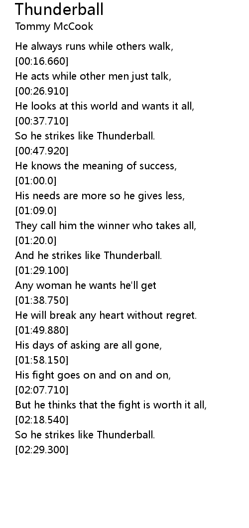| [02:20.0] | So he strikes like Thunderball. |