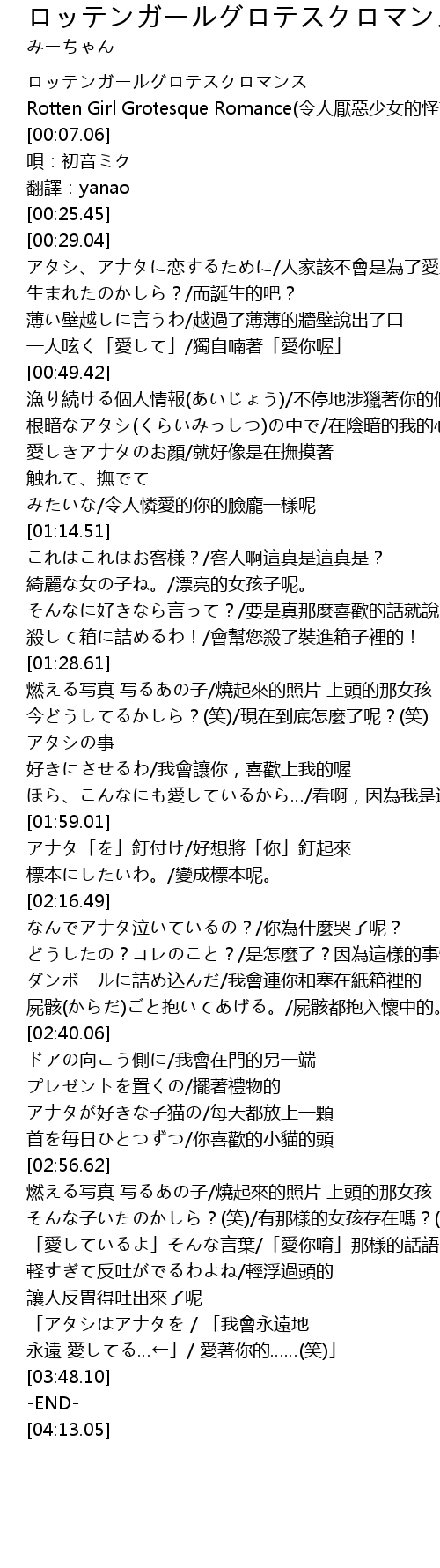 | [00:03.79] | Rotten Girl Grotesque Romance(令人厭惡少女的怪誕羅曼史) |