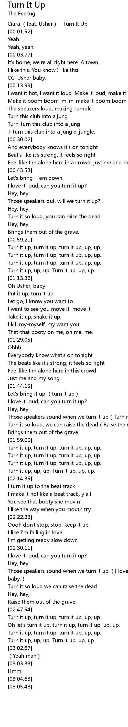 | [02:03.24] | Turn it up, turn it up, turn it up, up, up. |