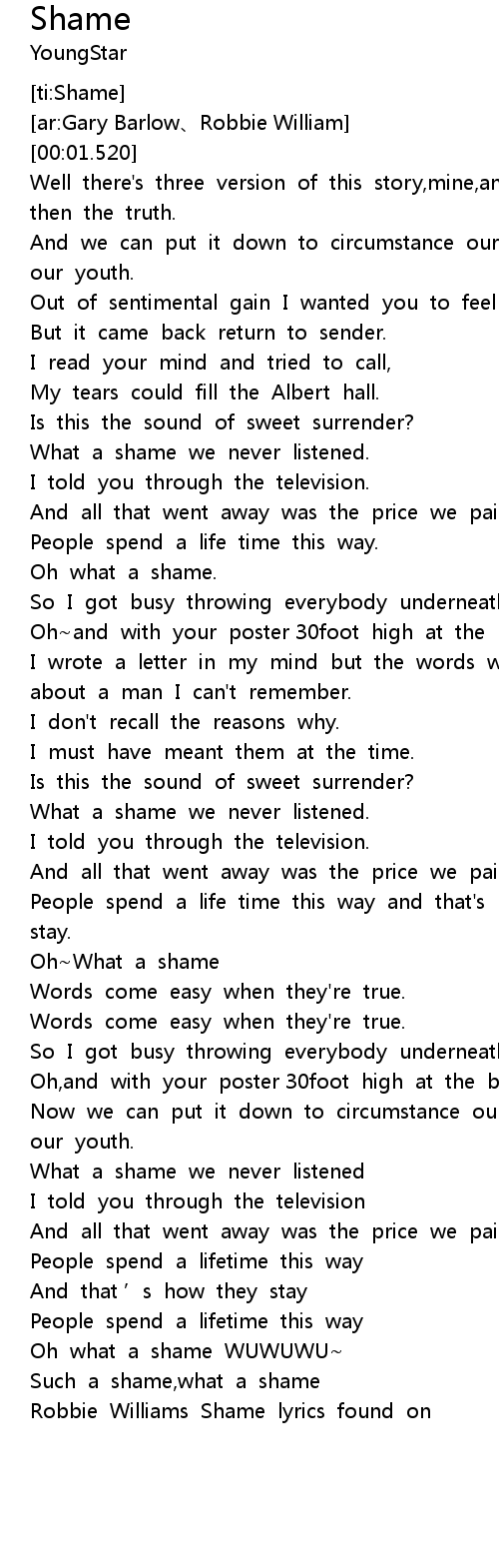 | [03:47.938] | Robbie Williams Shame lyrics found on |