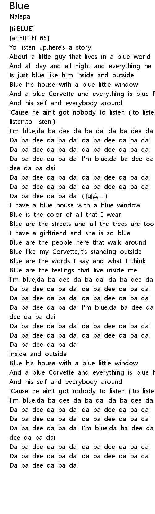 | [02:03.893] | Da ba dee da ba dai I' m blue, da ba dee da ba dai da ba dee da ba dai |