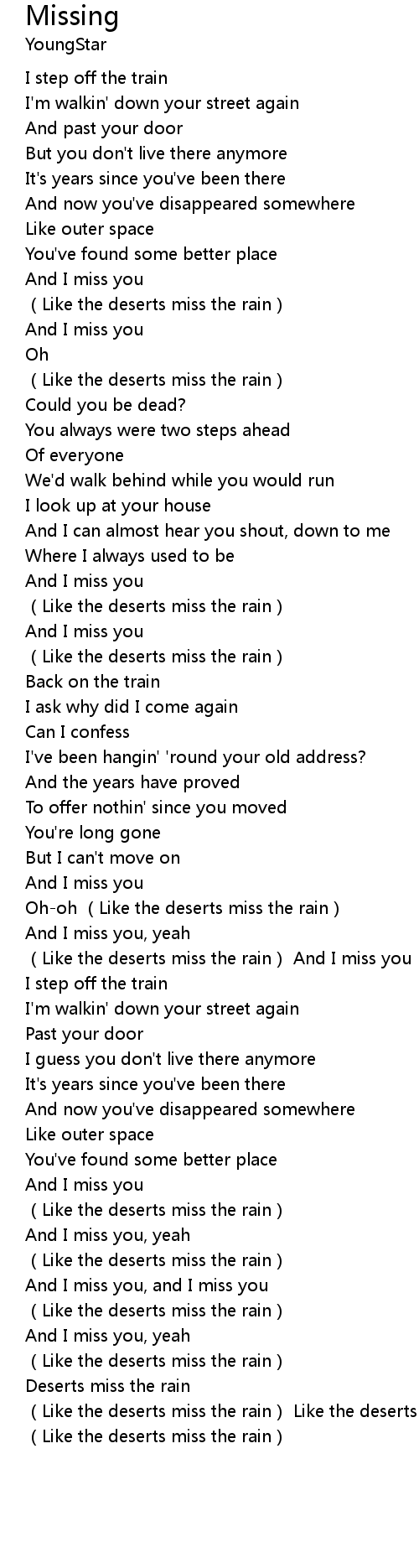 | [02:15.38] | (Like the deserts miss the rain) And I miss you |
