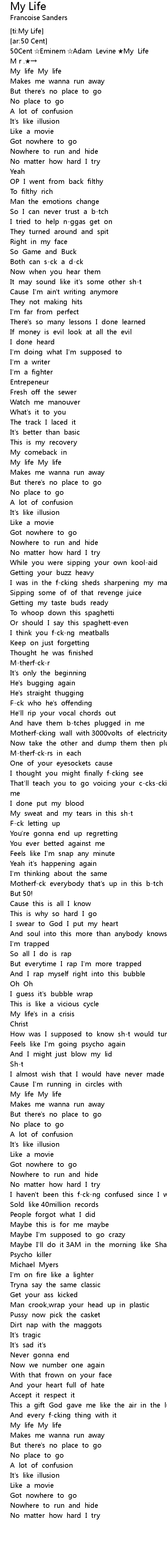 | [00:00.722] | 50Cent ☆Eminem ☆Adam Levine ★My Life |