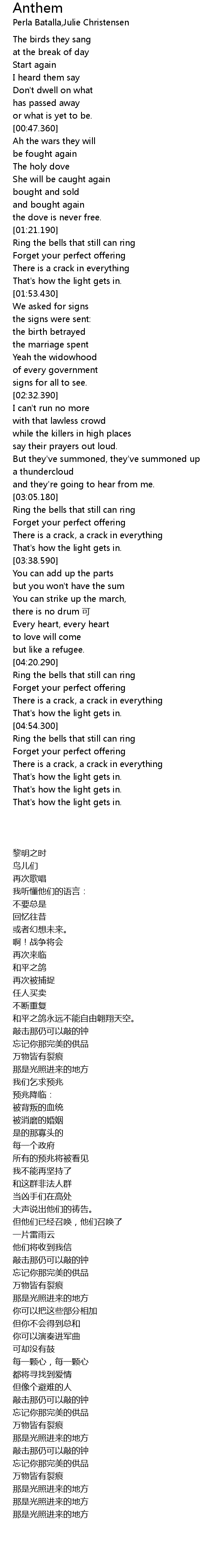 | [01:15.310] | 和平之鸽永远不能自由翱翔天空。 |