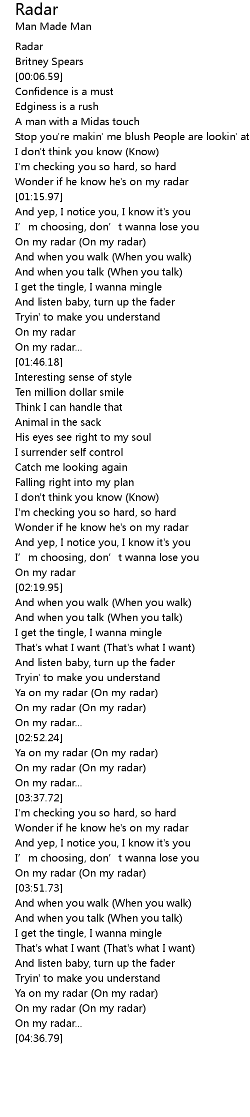 | [04:05.65] | Ya on my radar On my radar |