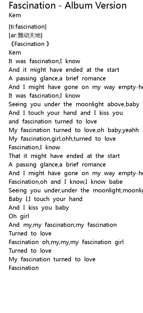 | [03:02.958] | Fascination,oh and I know,I know babe |
