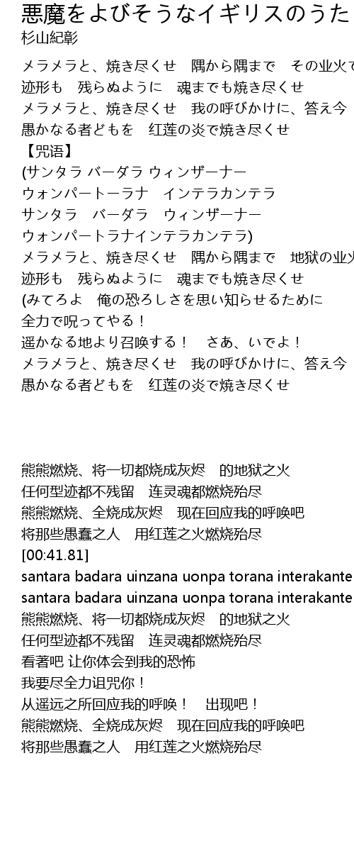 | [00:59.09] | メラメラと、焼き尽くせ 隅から隅まで 地狱の业火で |