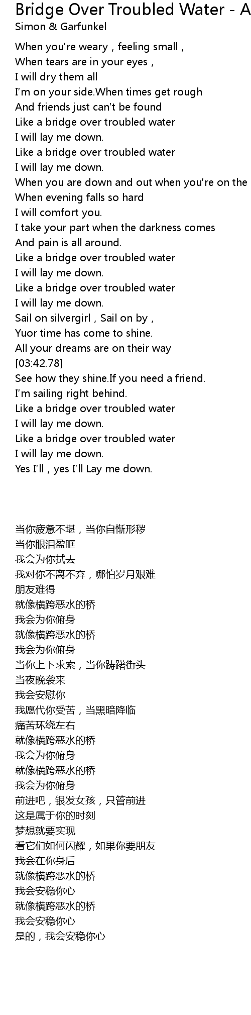| [02:38.54] | Like a bridge over troubled water |