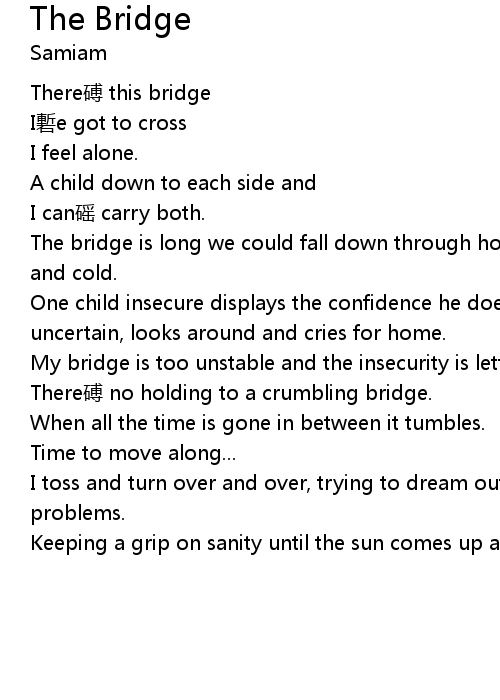 | The bridge is long we could fall down through holes, water all around; wind, wet and cold. | |