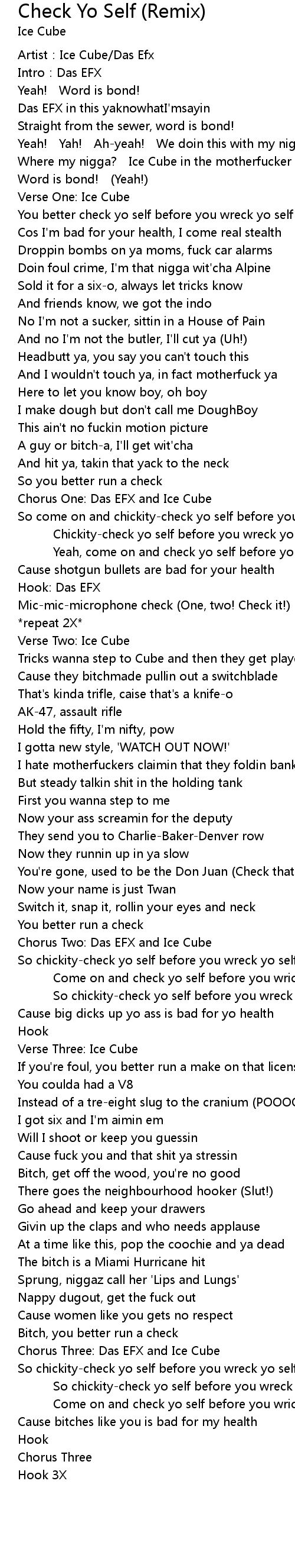 | [Das]So chickity-check yo self before you wreck yo self | |