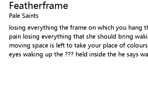 | losing everything the frame on which you hang the constant (???) the source of pain losing everything that she should bring waking up the ??? held inside the moving space is left to take your place of colours against the grain feel glass eyes waking up the ??? held inside the he says waking up the ??? |