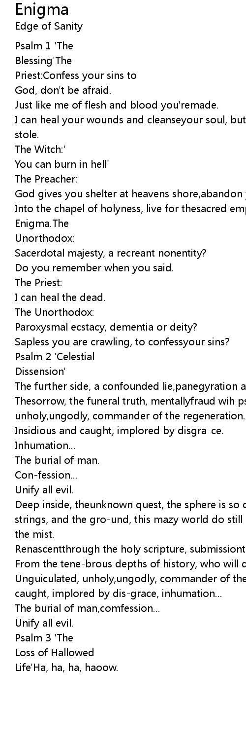 Deep inside, theunknown quest, the sphere is so depres-sed, a harp with broken strings, and the gro-und, this mazy world do still exist, theghouls arise from the mist. |