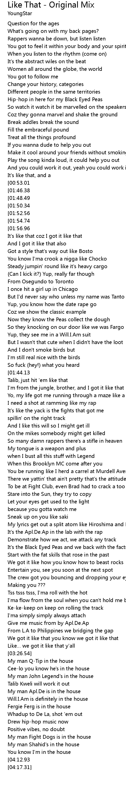 | [04:15.04][04:12.93][04:11.04] | Black Eyed Peas represent sellin out |