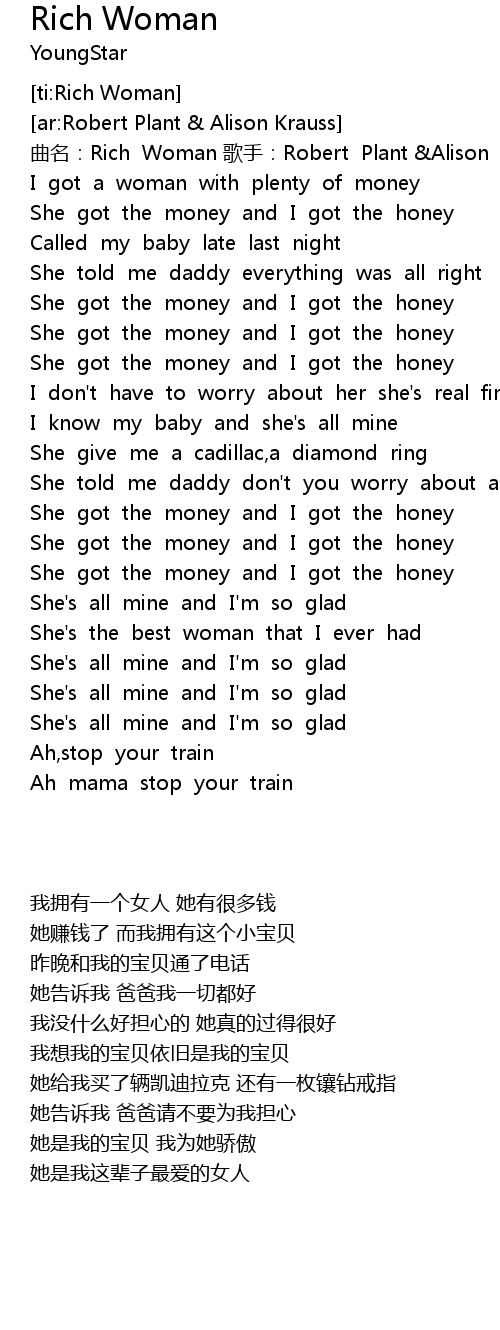 | [00:03.930] | qu ming: Rich Woman ge shou: Robert Plant Alison Krauss |