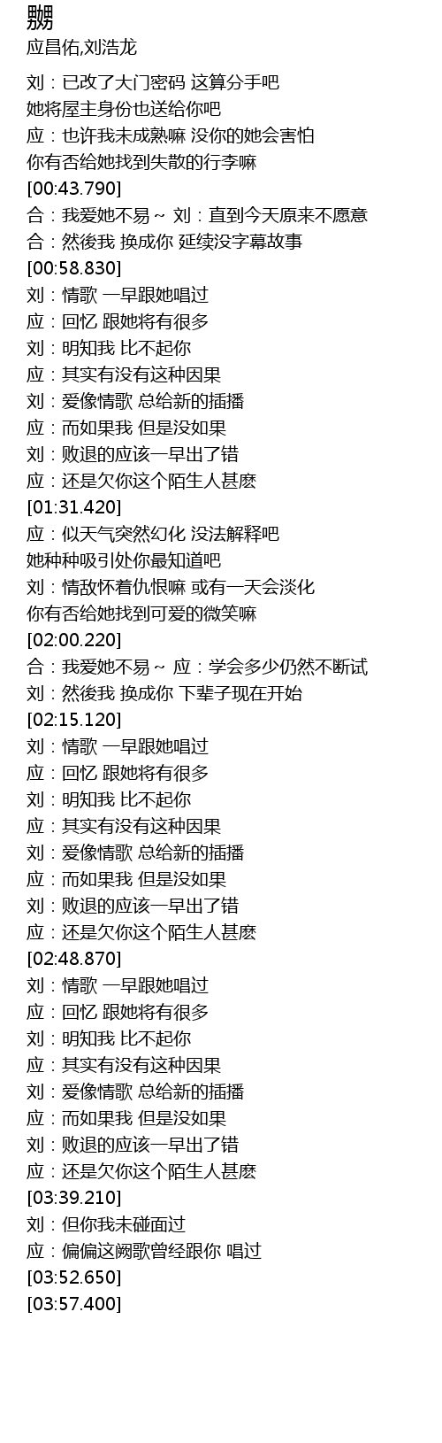 | [03:43.829] | 应:偏偏这阙歌曾经跟你 唱过 |