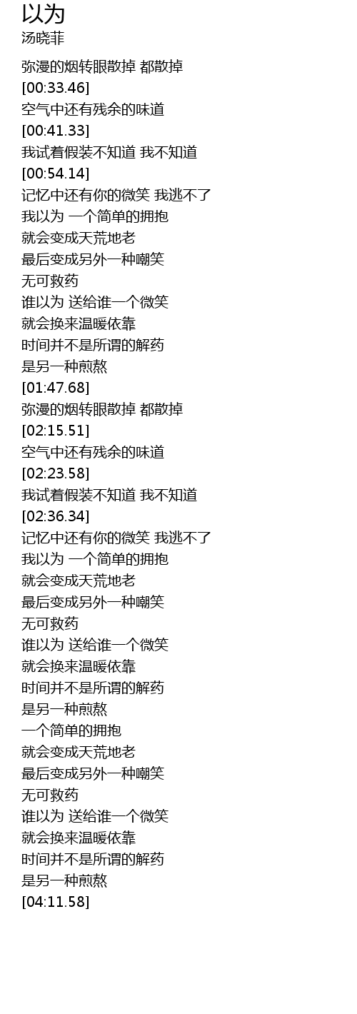 | [01:04.43] | 我以为 一个简单的拥抱 |