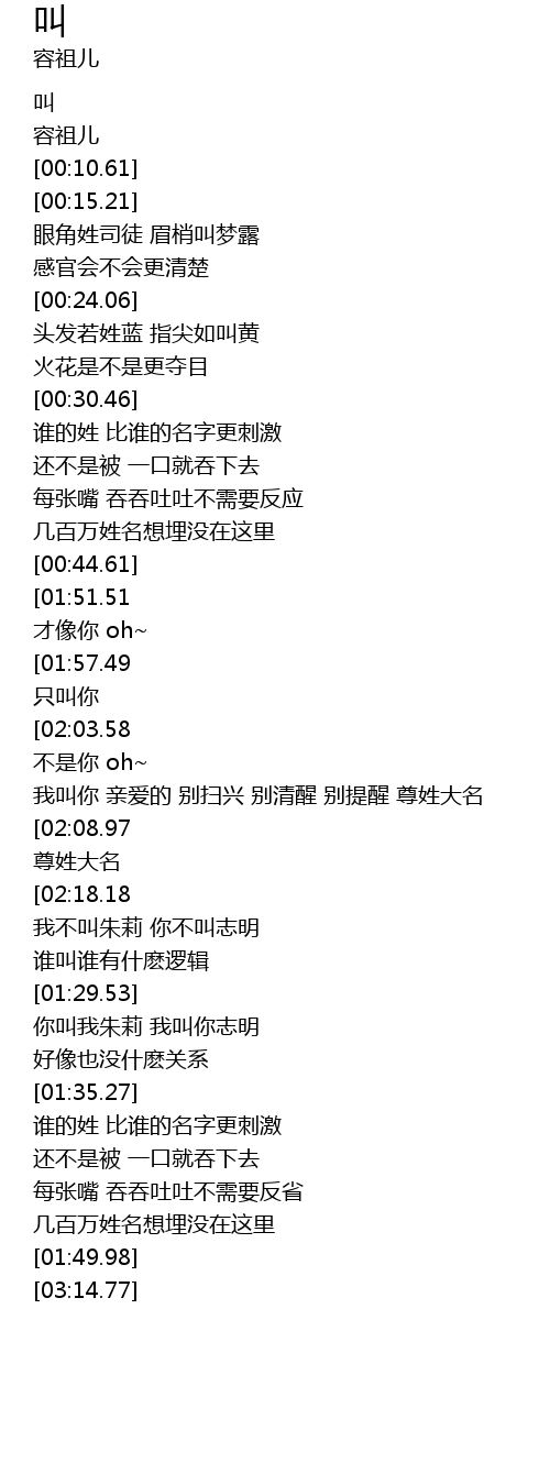 | [02:52.26][02:03.58][00:56.85] | 叫哈尼 叫北鼻 叫达令 叫什麽 不是我 不是你 oh~ |