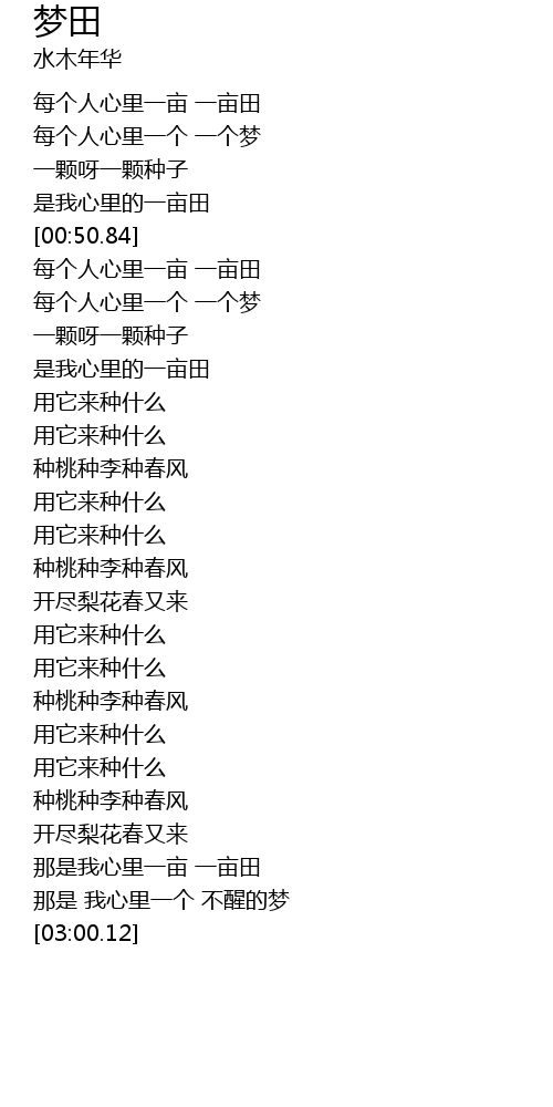 | [00:29.03] | 每个人心里一亩 一亩田 |