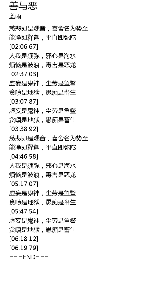 | [06:04.45] | 贪嗔是地狱,愚痴是畜生 |