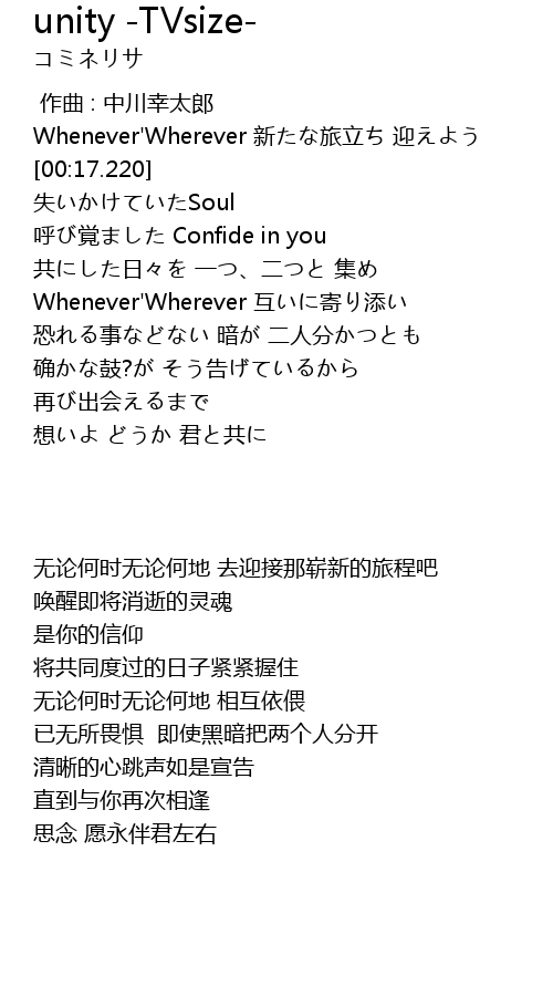 | [00:03.790] | Whenever'Wherever 新たな旅立ち 迎えよう |