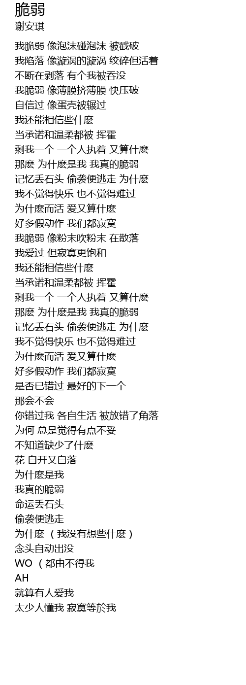 | [00:41.26] | 我脆弱 像薄膜挤薄膜 快压破 |