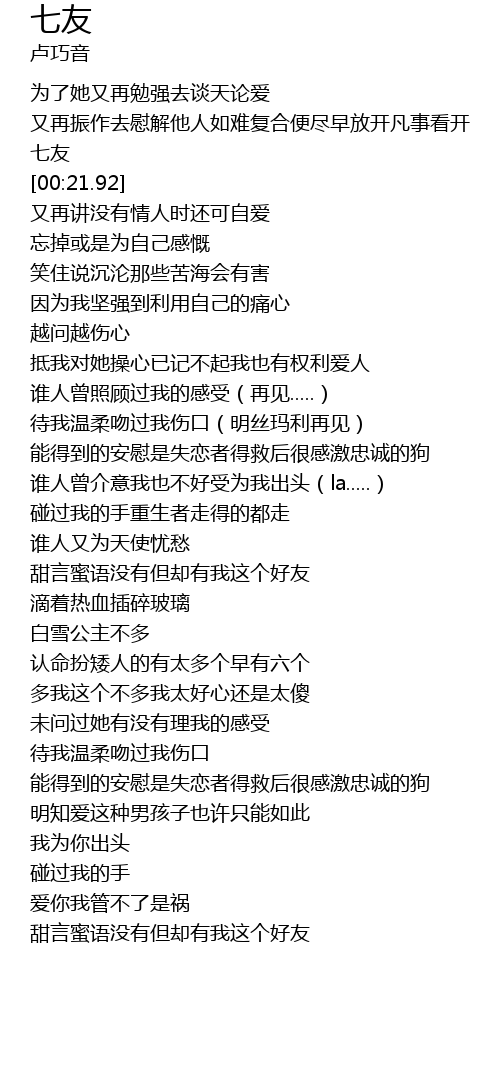 | [01:43.51] | duō wǒ zhè gè bù duō wǒ tài hǎo xīn hái shì tài shǎ |