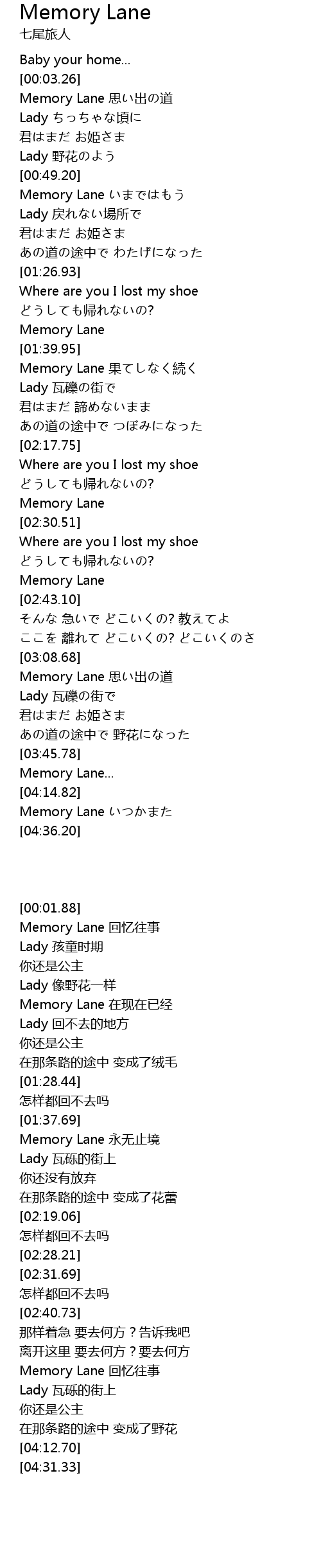 | [01:53.75] | Memory Lane 果てしなく続く |