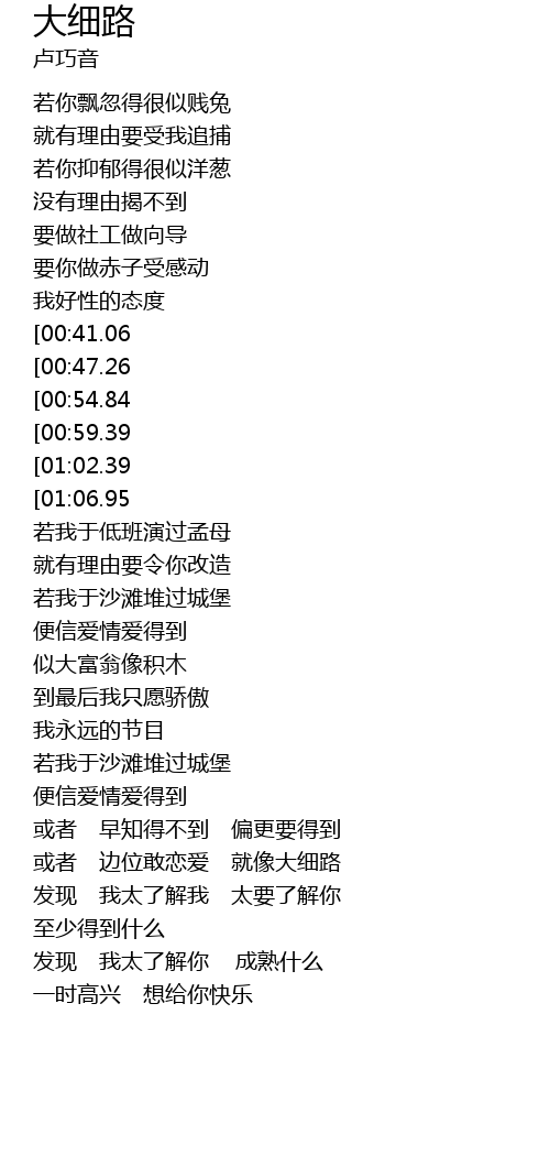| [01:57.23][00:47.26] | 或者 边位敢恋爱 就像大细路 |