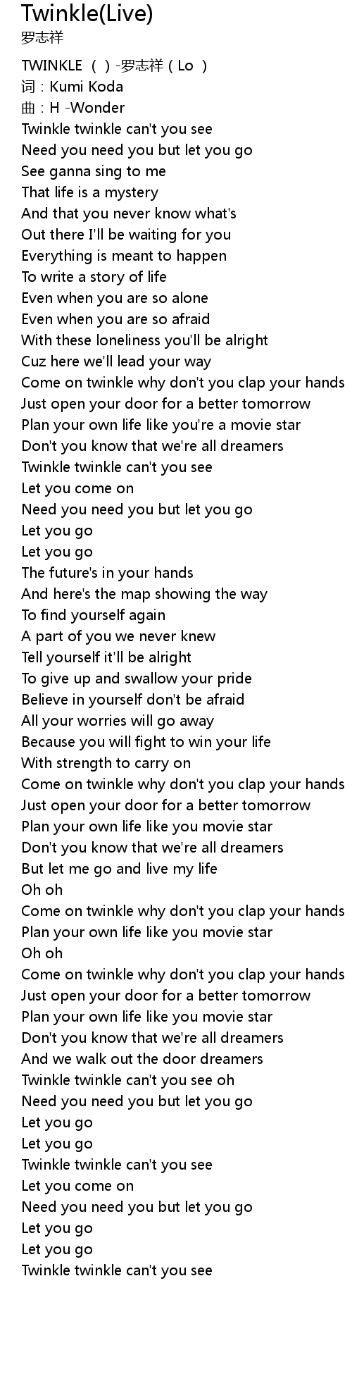 | [02:59.413] | Come on twinkle why don' t you clap your hands |
