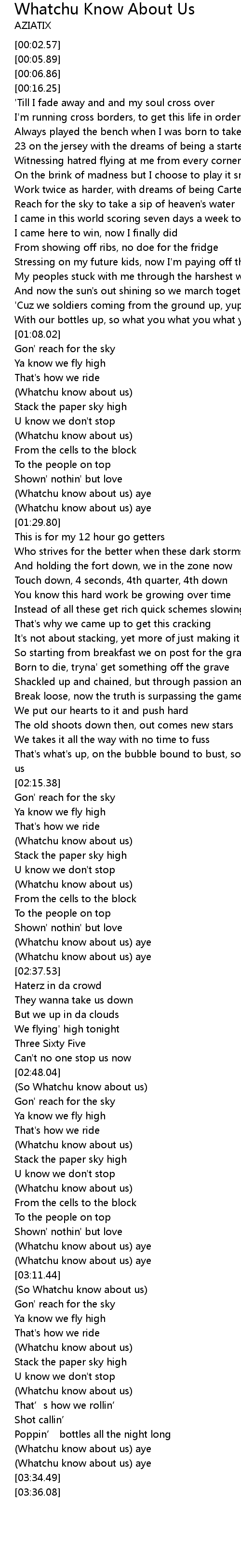 | [01:05.16] | With our bottles up, so what you what you what you know about us |