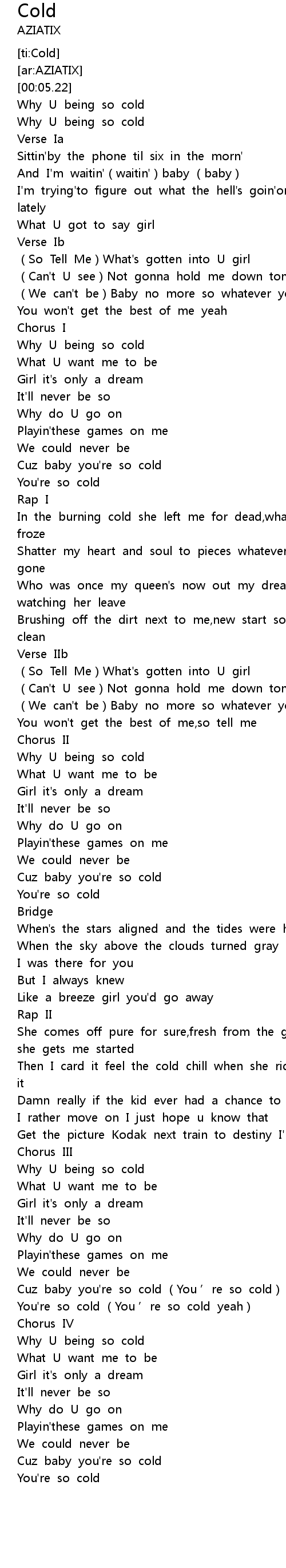 | [00:46.40] | Why U being so cold |