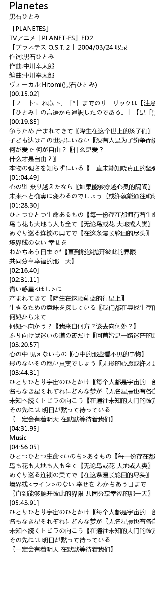 | [00:04.37] | 「プラネテス O.S.T. 2 」2004/03/24 収录 |