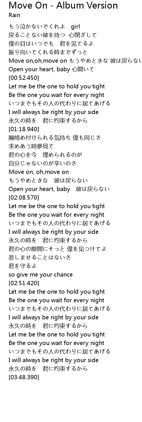 | [00:37.450] | Move on,oh,move on もうやめときな 彼は戻らない |