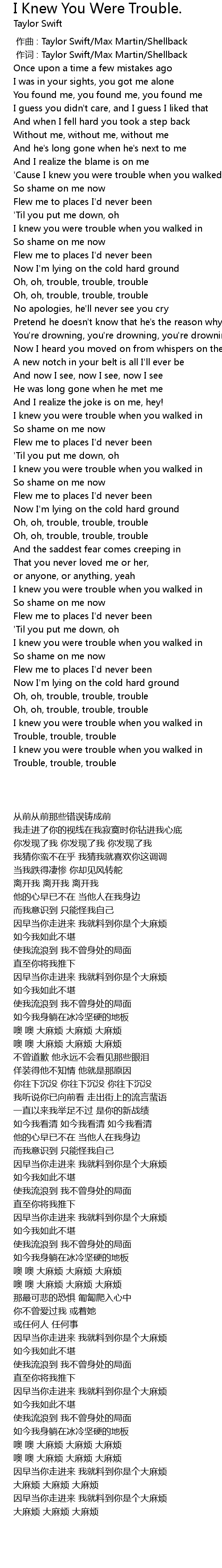| [00:40.190] | 'Cause I knew you were trouble when you walked in |