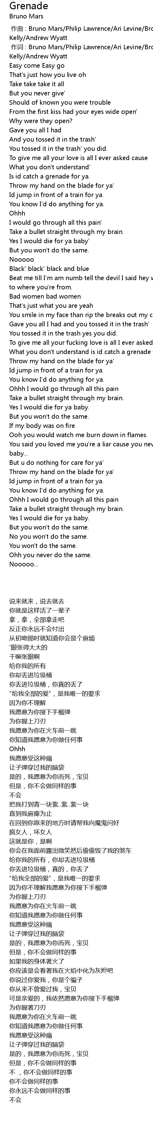 | [00:01.00] | zuò cí : Bruno Mars Philip Lawrence Ari Levine Brody Brown Claude Kelly Andrew Wyatt |