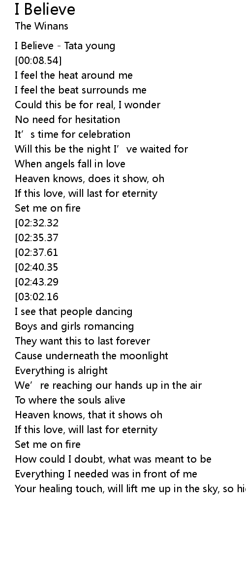 | [03:06.18][03:02.16][02:46.03][01:57.08][01:04.10] | Oh I believe, I believe |