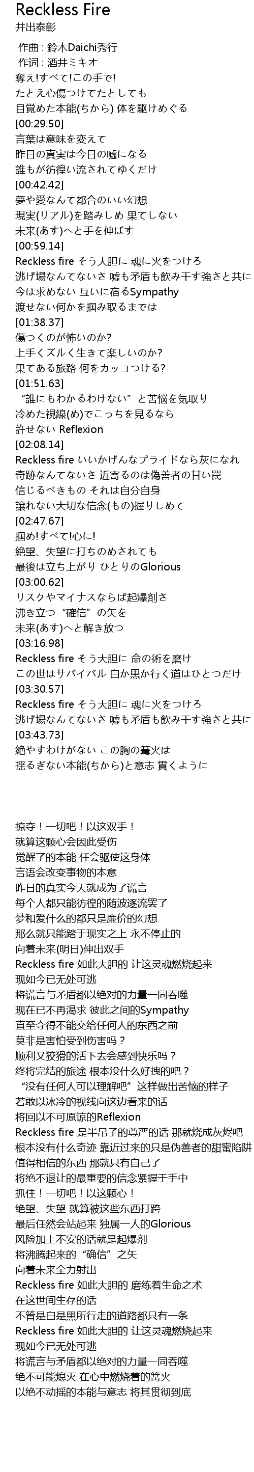 | [03:30.58] | Reckless fire そう大胆に 魂に火をつけろ |