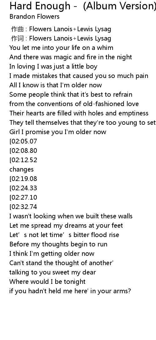 | [03:06.84][02:08.80][01:10.87] | I know it's been hard enough on me |