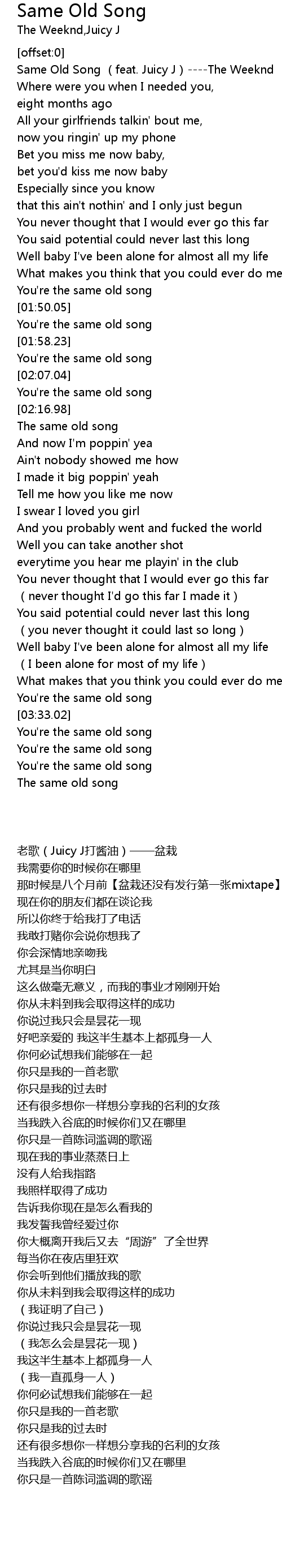 | [00:08.37] | Same Old Song (feat. Juicy J)----The Weeknd |