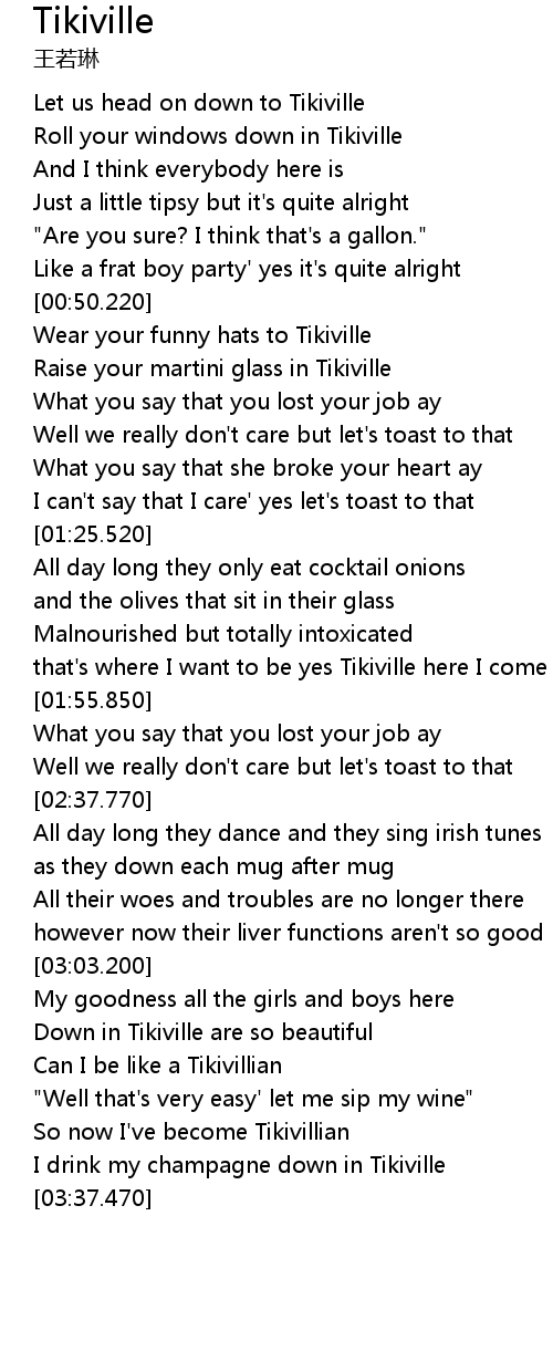 | [00:21.610] | Roll your windows down in Tikiville |