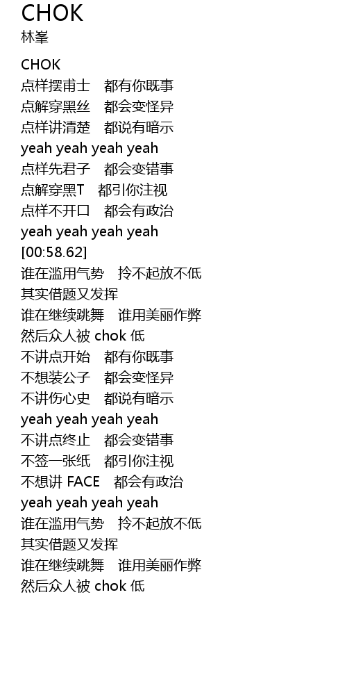 | [01:17.34] | 然后众人被 chok 低 |