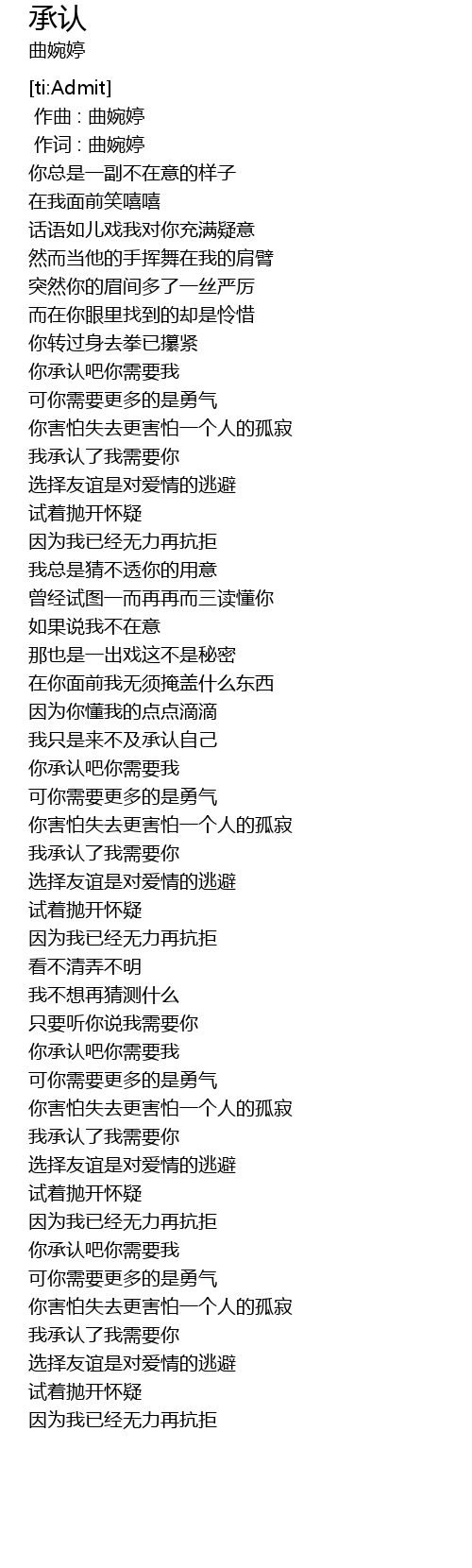 | [03:47.560] | wǒ chéng rèn le wǒ xū yào nǐ |