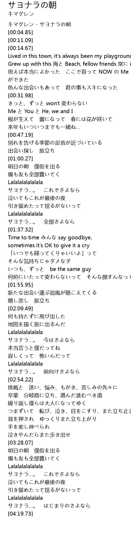 | [00:01.12] | キマグレン - サヨナラの朝 |